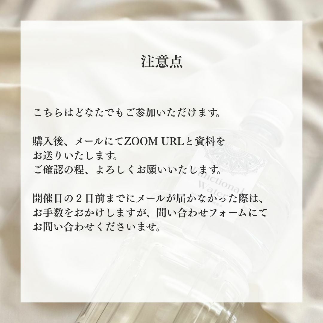 他の画像を見る 【6月25日10時~開催】 お水のお話会 ¥ 2,000 税込 販売開始前です。 販売期間 2026/05/29 0:00 〜 2026/06/21 23:59 詳細を見る お気に入りに登録する