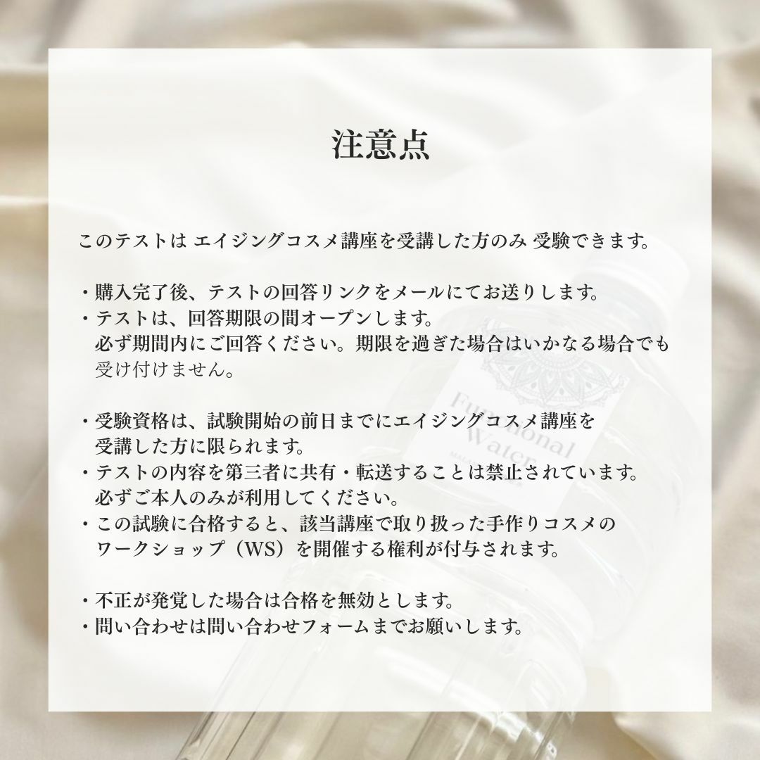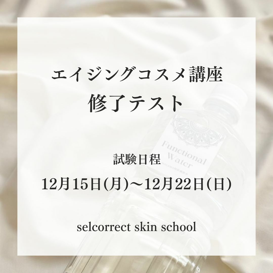 他の画像を見る 【試験期間12月15日~12月22日】 エイジングコスメ講座修了テスト ¥ 30,000 税込 販売開始前です。 販売期間 2025/11/24 0:00 〜 2025/11/30 23:59 詳細を見る お気に入りに登録する
